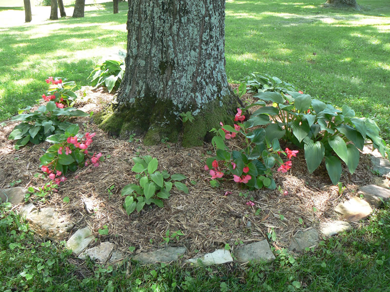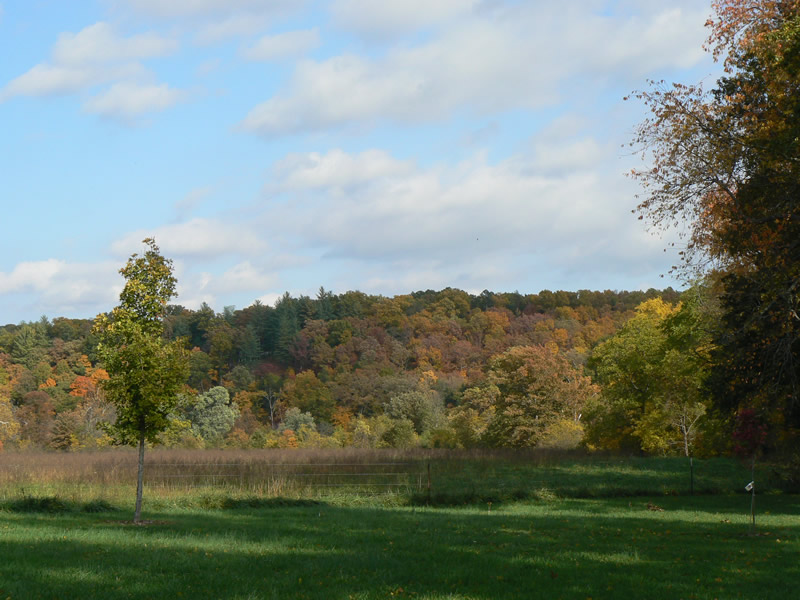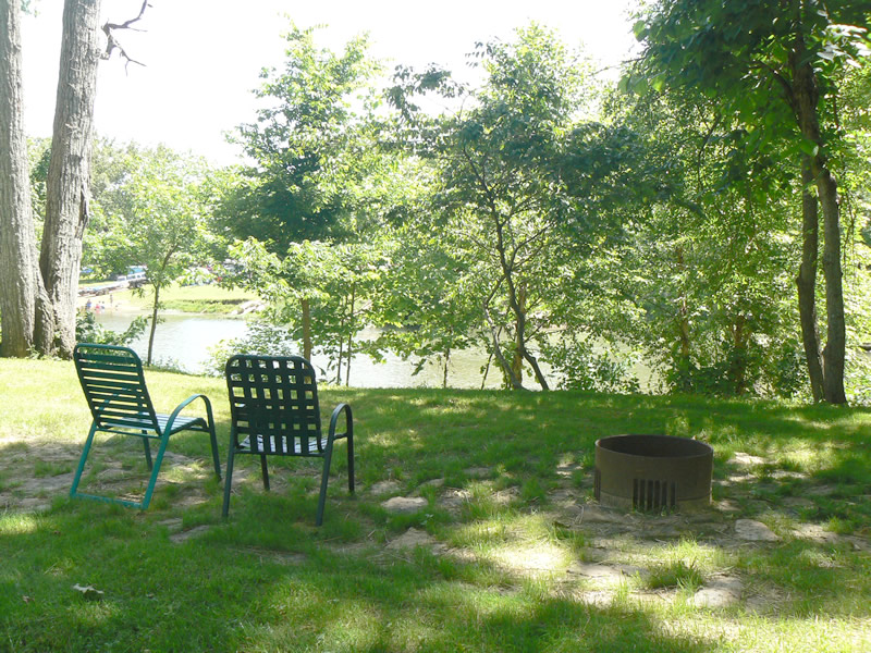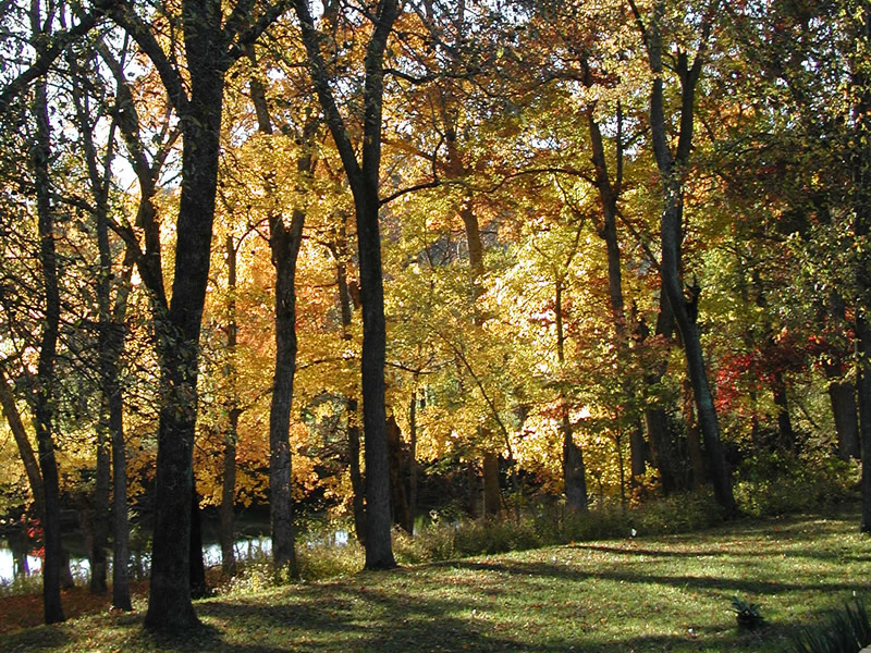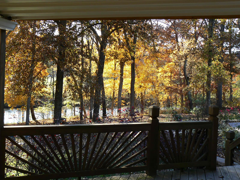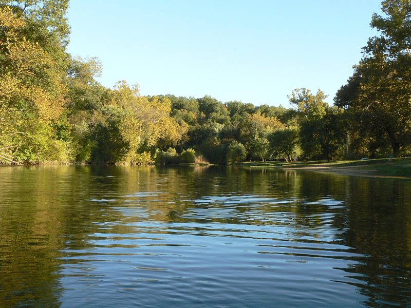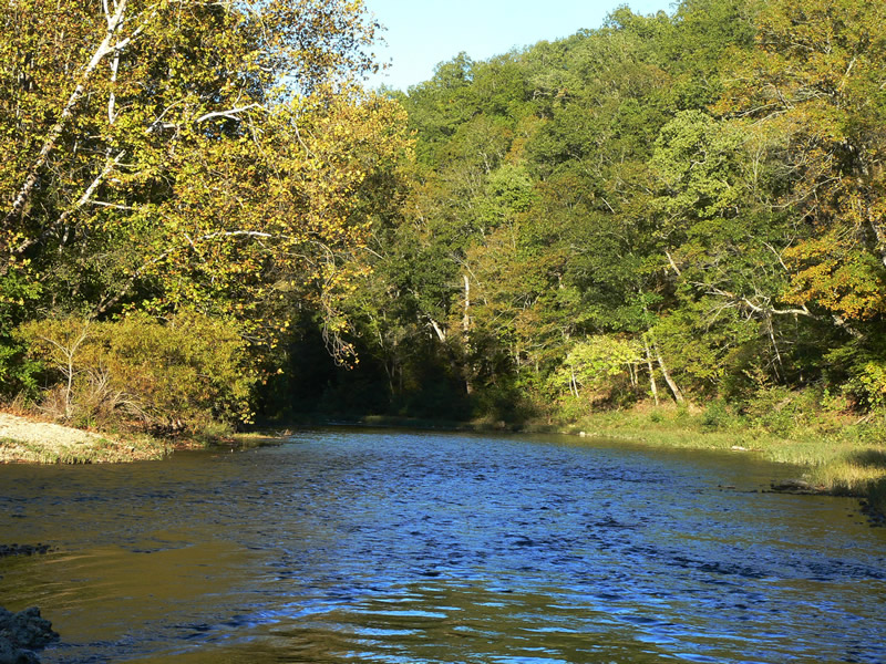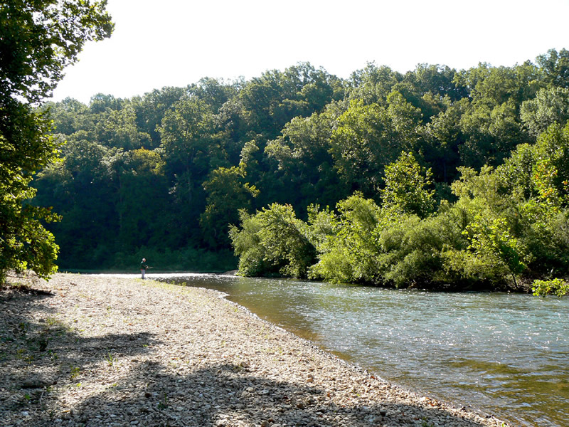 The Ozark foothills are covered with dense oak woods, down to the river's edge in many places. Sycamores, maple and river birch are native to the rivers edge and seed themselves every spring. This natural landscaping provides wonderful shade and fall color everywhere they are allowed to flourish.