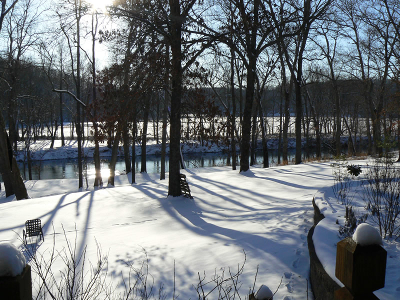 Winter is the quiet time at the home on the Meramec. The bird and animal chatter is less urgent and an occasional snow will blanket their homes as well as your's. The river runs lower and thus, more slowly so that ice forms along the edge during cold spells.