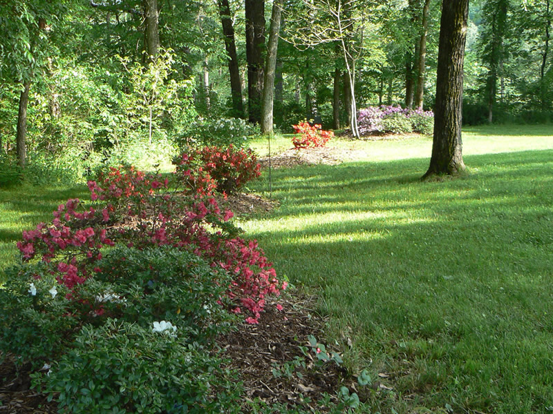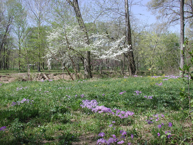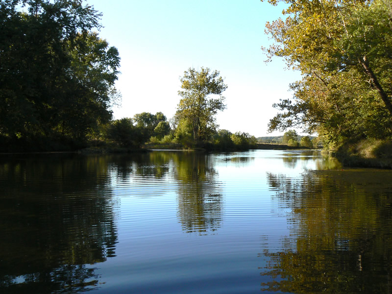 The Ozark foothills are covered with dense oak woods, down to the river's edge in many places. Sycamores, maple and river birch are native to the rivers edge and seed themselves every spring. This natural landscaping provides wonderful shade and fall color everywhere they are allowed to flourish.